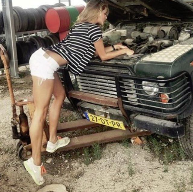 Tânărul model stă aplecată deasupra unei maşini, este îmbrăcată într-o epreche de pantaloni minusculi albi şi îşi unduieşte spatele pentru a-şi scoate în evidenţă posteriorul bombat. Mihaela Rădulescu a lăudat-o pentru asta.