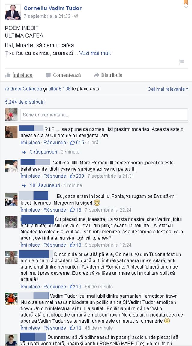 Ce a apărut pe pagina de Facebook a lui Corneliu Vadim Tudor