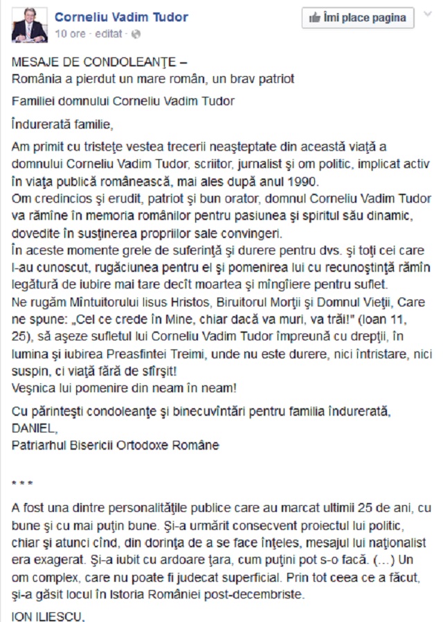 Corneliu Vadim Tudor s-a stins din viaţă, luni seara, în urma unui infarct. Tribunul a lăsat în urma lui familia îndurerată şi sute de prieteni care nu au apucat să-i spună o ultimă vorbă. După înmormântarea acestuia, prietenii virtuali ai fostului politician au rămas fără cuvinte.