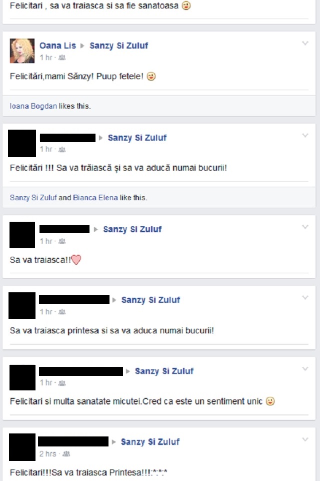 Sute de mesaje din partea fanilor şi admiratorilor au fost postate pe pagina oficială a Sânzianei Buruiană şi a lui Nicolae Zuluf. Felicitările au curs şi urările de bine sunt interminabile. Toţi fanii celor doi le urează sănătate şi îşi doresc ca fetiţa să fie norocoasă. Printre primii care le-au făcut urări celor doi părinţi se numără şi Oana Lis.