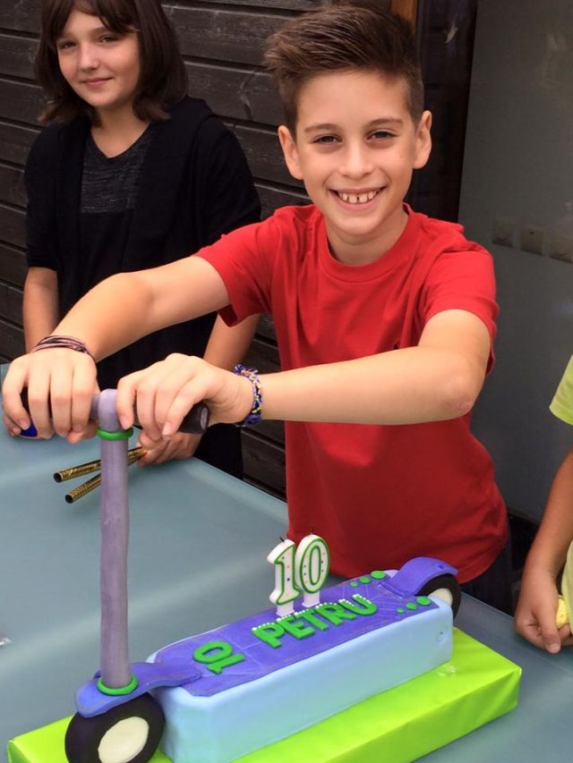"<<Trotineta e viaţa mea>> îmi spune Petru într-o bună zi când eu îi număram juliturile şi vânătăile. Normal, nu putea avea alt tort decât asemenea a ce îi umple acum viaţa cel mai mult. Şi-a invitat prietenii de trotinetă într-un loc unde au acces copiii de la 10-99 de ani! Un fost coleg inspirat a deschis o lume altfel pentru copii mari şi adulţi mici!", a scris Andreea Berecleanu pe Facebook.