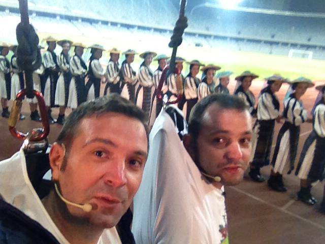 Agăţaţi de tricouri, showmanii prezintă spectacolul folcloric. "Ce fac oare Buzdu şi Morar noaptea pe un stadion din Ardeal, cu Fetele de la Căpâlna?", a scris Buzdu pe Facebook, inducându-şi prietenii virtuali în eroare. Ei bine, nimeni nu se aştepta să-i vadă într-o asemenea ipostază.