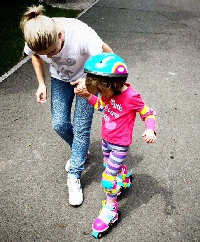 Îmbrăcată colorat, Alessia Ecaterina, în vârstă de 4 ani, învaţă să meargă cu rolele. Pentru a nu se răni, mama a avut grijă să o echipeze cu o cască de protecţie şi gununchiere.