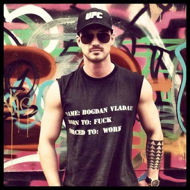 Fostul "burlac" şi-a luat un tricou cu un mesaj care le-a dat pe spate pe fane. "Născut pentru a face sex, obligat să muncesc", scrie pe haina lui Bogdan. Ca să transmită mai bine atitudinea sa rebelă, Vlădău s-a fotografiat în faţa unui zid plin cu grafitti, şi-a pus o şapcă pe cap şi ochelari de soare.