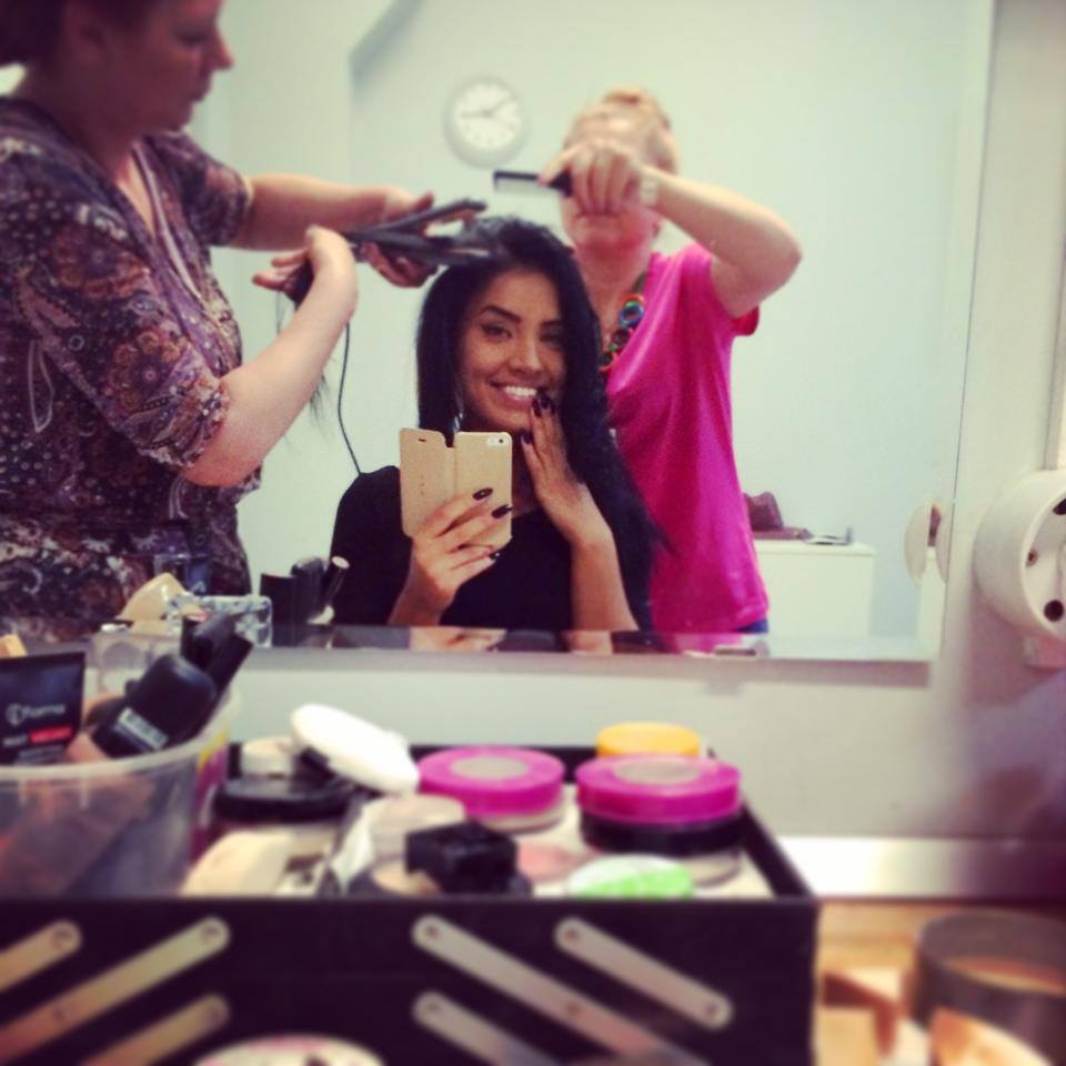 Pentru că era pe ultima sută de metri, Adelina a trebuit să "suporte" răsfăţul de a fi coafată pe repede-înainte, cu două unelte de aranjat părul şi de către două coafeze în acelaşi timp. Bruneta n-.a ratat ocazia de a-şi face o poză cu telefonul, pe care a publicat-o rapid pe Facebook ca să le arate şi prietenilor ei "virtuali" cum se pregăteşte ea înainte de a intra în direct la TV.