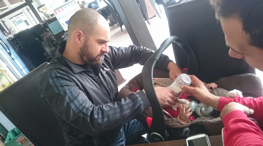 Robert, alături de un prieten, vrea să îşi hrănească fiul, dar se pare că acest lucru este mai greu de realizat decât şi-a imaginat el. "Bărbaţii la datorie", au scris în dreptul fotografiei. "Munca în echipă", a comentat rapid cineva.