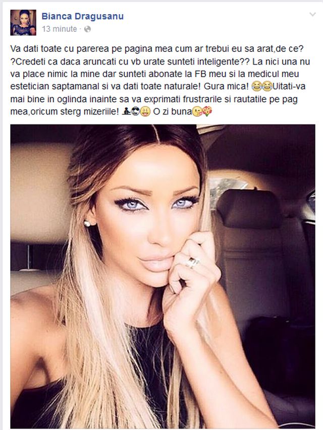 "Vă daţi toate cu părerea pe pagina mea cum ar trebui eu să arăt, de ce? Credeţi că dacă aruncaţi cu vorbe urâte sunteţi inteligente? La nici una nu vă place nimic la mine, dar sunteţi abonate la Facebook-ul meu şi la medicul meu estetician săptămânal şi vă daţi toate naturale! Gura mică! Uitaţi-vă mai bine în oglindă înainte să vă exprimaţi frustrările şi răutăţile pe pagina mea, oricum şterg mizeriile!", le-a spus Bianca Drăguşanu doamnelor şi domnişoarelor care-i comentează la postări, deranjată de vorbele acestora.