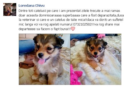 Asistenta a făcut un anunţ pe contul ei de Facebook, privind adoptarea unui căţel abandonat. Postarea a stârnit reacţii pline de admiraţie la adresa vedetei şi pentru prima oară complimentele nu mai erau la adresa sex appeal-ului ei!