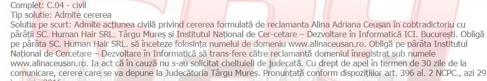 ”Admite acţiunea civilă privind cererea formulată de reclamanta Alina Adriana Ceuşan în cobtradictoriu cu pârâţii SC. Human Hair SRL. Târgu Mureş şi Institutul Naţional de Cercetare – Dezvoltare în Informatică ICI Bucureşti. Obligă pe pârâta SC. Human Hair SRL. să înceteze folosinţa numelui de domeniu www.alinaceusan.ro. Obligă pe pârâta Institutul Naţional de Cercetare – Dezvoltare în Informatică să transfere către reclamantă domeniul înregistrat sub numele www.alinaceusan.ro”, au decis magistrații.