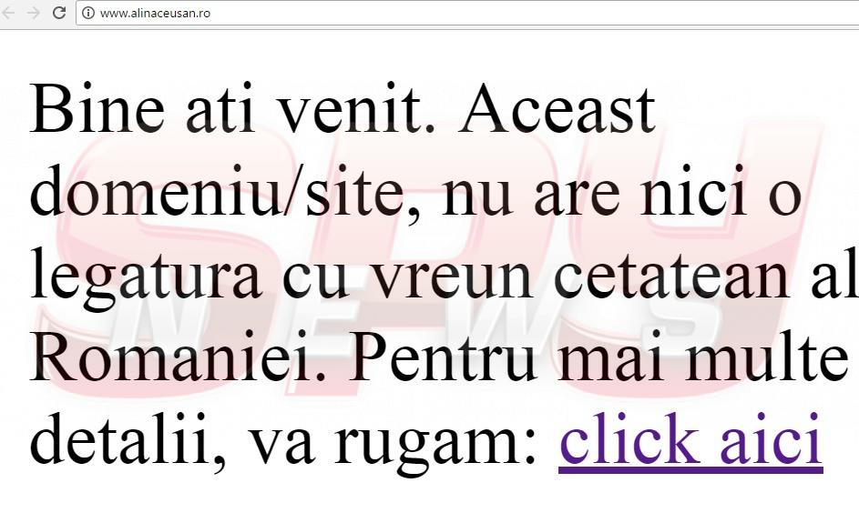 Însă, nu mai departe de ieri, domeniul www.alinaceusan.ro figura în documentele oficiale ca fiind proprietatea firmei Human Hair SRL, semn că patronul societății nu a dat doi bani pe sentința judecătorească. Și, ca să îi facă în ciudă bloggeriței, proprietarul site-ului a afișat un mesaj buclucaș pe pagina principală: ”Bine ați venit. Acest domeniu/site nu are nicio legătură cu vreun cetățean al României. Pentru mai multe detalii, vă rugăm: click aici!”
