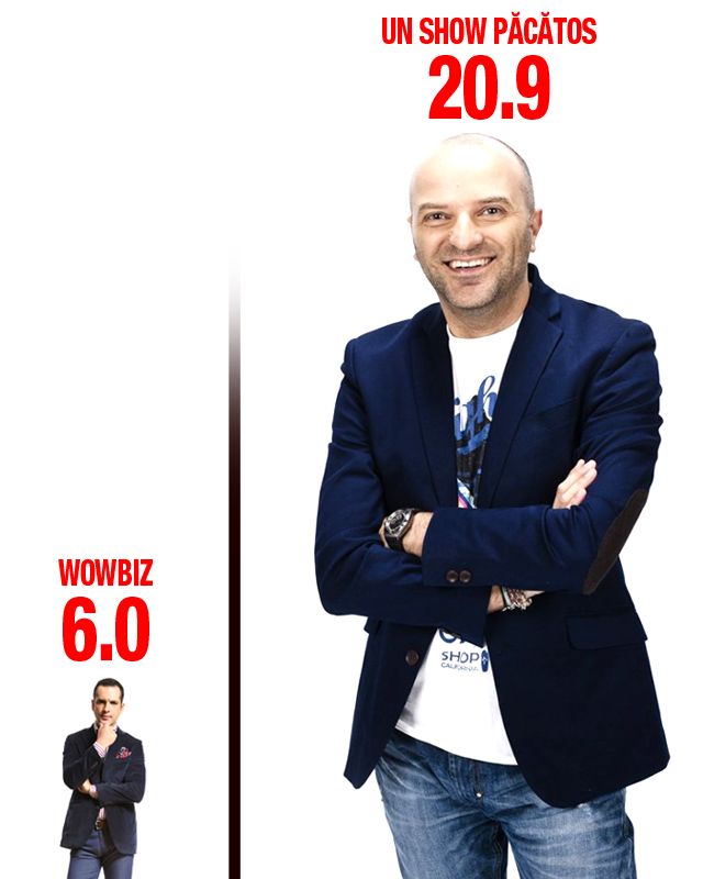 Diferenţa uriaşă dintre Dan Capatos şi principalul competitor de la Kanal D este zdrobitoare. În intervalul orar în care cele două emisii se intersectează, cifrele au arătat aşa: "Un show păcătos" - share 20,9, "Wowbiz" - share 6,0. Echipa "păcătoasă" vă mulţumeşte pentru fidelitate!
