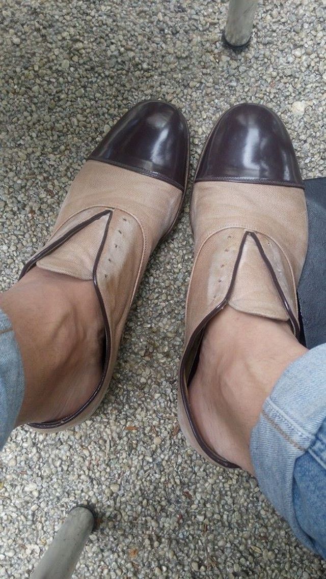 Mesajul este însoţit şi de o fotografie în care creatorul de modă este încălţat cu o pereche de pantofi care îi cam joacă în picioare.