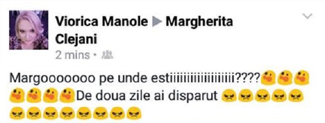 "Margo, pe unde eşti? De două zile ai dispărut", a scris Viorica pe pagina de Facebook a fiicei ei, mesaj însoţit de multe emoticoane ce exprimă starea de supărare a artistei.