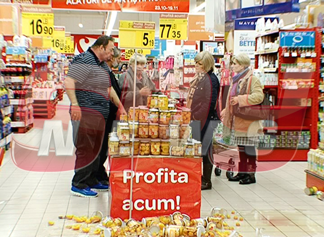 A încercat să scape de cei doi oameni care pur şi simplu o sâcăiau cu doleanţele lor. Nervoasă şi stresată, vedeta a ajuns în dreptul unei mese pline cu borcane de compot dispuse în formă de piramidă, unde a avut parte de un adevărat şoc. Când a vrut să ia un produs, toate s-au prăbuşit!