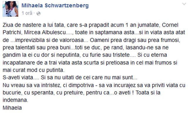 "Ziua de naştere a lui tata, care s-a prăpădit acum 1 an jumătate, Cornel Patrichi, Mircea Albulescu, toate în săptămâna asta şi în viaţa asta atât de imprevizibilă şi de valoroasă. Oameni prea dragi sau prea frumoşi, prea talentaţi sau prea buni, toti se duc, pe rând, lăsându-ne să ne gândim la ei cu dor şi neputinţă, cu furie sau tristeţe. Şi cu eterna încăpăţânare de a trăi viaţa asta scurtă şi preţioasă în cel mai frumos şi mai curat mod cu putinţă. S-aveţi viaţă. Şi să nu uitaţi de cei care nu mai sunt. Nu vreau să vă întristez, ci dimpotrivă - să vă încurajez să vă priviţi viaţa cu bucurie, cu speranţă, cu preţuire, pentru că...o aveţi! Toată şi la îndemână", le-a spus Mihaela Rădulescu prietenilor ei virtuali.
