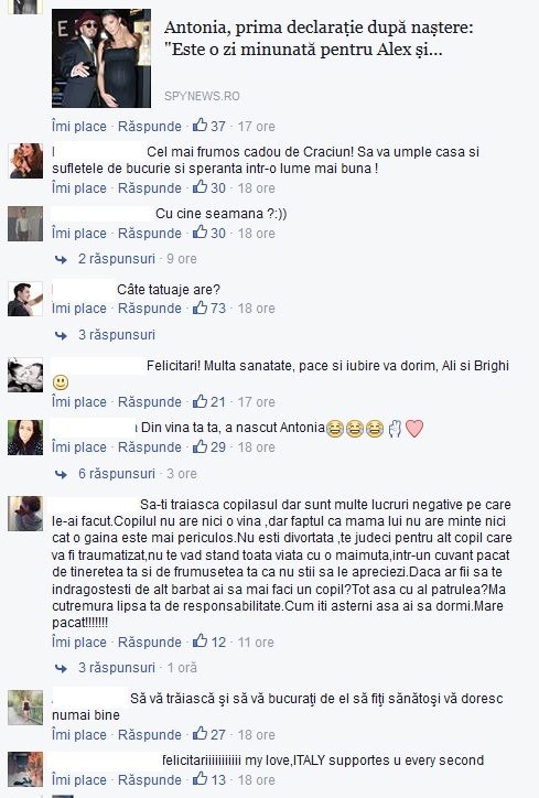 "Să-ţi trăiască copilaşul, dar sunt multe lucruri negative pe care le-ai facut. Copilul nu are nici o vină, dar faptul că mama lui nu are minte nici cât o gaină este mai periculos. Nu eşti divorţată, te judeci pentru alt copil care va fi traumatizat, nu te văd stând toată viaţa cu o maimuţă, într-un cuvânt păcat de tinereţea ta şi de frumuseţea ta că nu ştii să le apreciezi. Dacă ar fi să te îndrăgosteşti de alt barbat ai să mai faci un copil? Tot aşa cu al patrulea? Mă cutremură lipsa ta de responsabilitate. Cum îţi aşterni aşa ai să dormi. Mare pacat!!!!!!!", i-a scris una dintre fane.