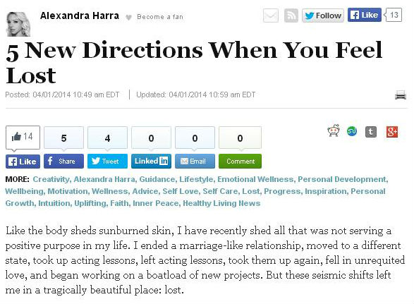 Alexandra Harra a avut ocazia de a scrie pentru cunoscuta publicaţie "Huffington Post", unde a avut, de altfel şi o rubrică specială. Printre temele tratate de ea se regăsesc spiritualitatea, stilul de viaţă, meditaţia şi dezvoltarea personală.