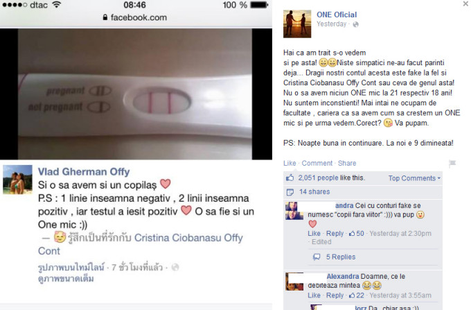 "Hai că am trăit s-o vedem și pe asta! Niște simpatici ne-au făcut părinți deja... Dragii noștri, contul acesta este fake la fel și Cristina Ciobănașu Offy Cont sau ceva de genul ăsta! Nu o să avem niciun ONE mic la 21, respectiv 18 ani! Nu suntem inconștienți! Mai întâi ne ocupam de facultate, carieră ca să avem cum să creștem un ONE mic și pe urmă vedem. Corect? Va pupăm", au scris cei doi pe contul oficial de socializare.
