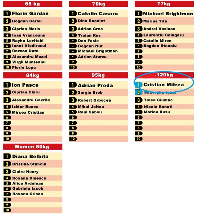 "Clasamentele conţin doar luptători care evoluează pentru cluburi din România sau care au cel puţin 2 lupte în România (în cazul luptătorilor straini)
