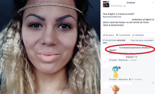 Prietenii virtuali ai Cristinei nu au fost însă atât de impresionaţi de rezultat ca aceasta: "Ţi-ai desenat sprânceana dreaptă cu stânga?".