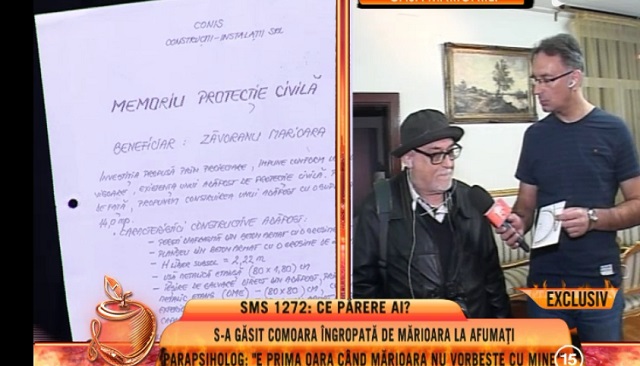"Am găsit şi am văzut cu ochii mei nişte bijuterii şi nişte haine care nu-mi explic cum ar fi apărut dacă nu le-ar fi dus chiar Mărioara acolo. Eu am spus că am văzut pe schiţa vilei din Afumaţi un buncăr. Iată şi schiţa casei care atestă existenţa acestui buncăr. Mărioara a atestat acest buncăr anual. Am aflat că acest buncăr, conform schiţelor, ar fi sub scară, intrare care ar fi blocată. Eu nu înţeleg de ce faci un buncăr pe care-l reactualizezi şi pentru care plăteşti dacă-l blochezi", a declarat Oana Zăvoranu la "Un show păcătos", de la Antena 1.