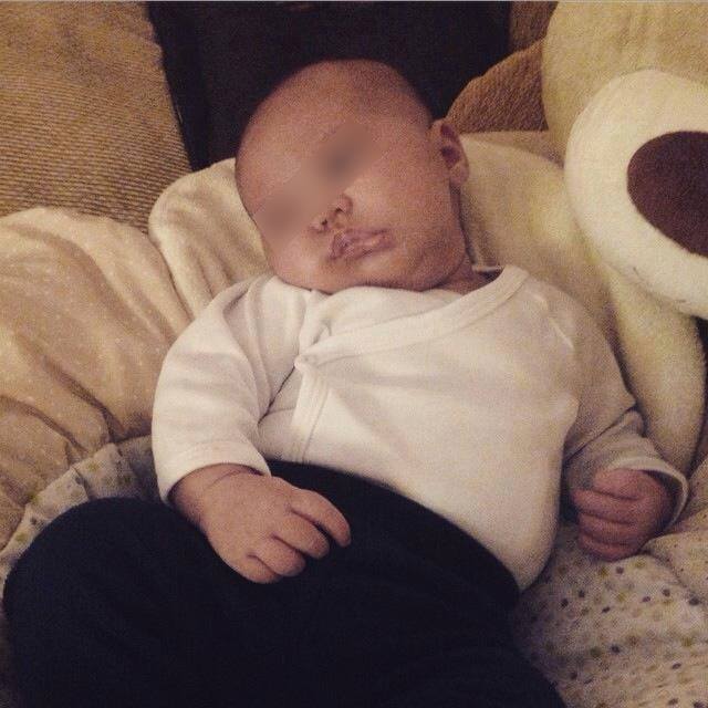 Artista şi-a fotografiat fiul într-una din cele mai amuzante poziţii, întins în pat, cu capul înclinat şi cu unul din ochi pe jumătate închis.