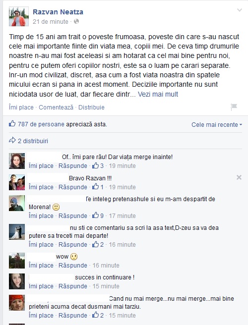 "Of... îmi pare rău! Dar viaţa merge înainte!" / "Bravo, Răzvan" / "Te înţeleg, pretenaşule. Şi eu m-am despărţit" / "Nu ştii ce comentariu să scrii la aşa text. Dumnezeu să vă dea putere să treceţi mai departe",
