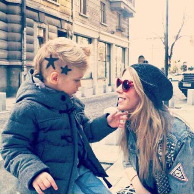 Căţărat pe un dig, copilul o mângâie dulce pe mama sa, care radiază de fericire. Din unghiul în care a fost fotografiat, băiatuui i se vede tunsoarea şmecheră pe care Corina i-a făcut-o, tunsoare care include şi... douză stele "tatuate". Fanii au apreciat că blonda îşi găseşte timp pentru micuţ, însă au sărit s-o critice pentru gestul necugetat de a-i face acestuia un tatuaj atât de mare la o vârstă atât de fragedă.