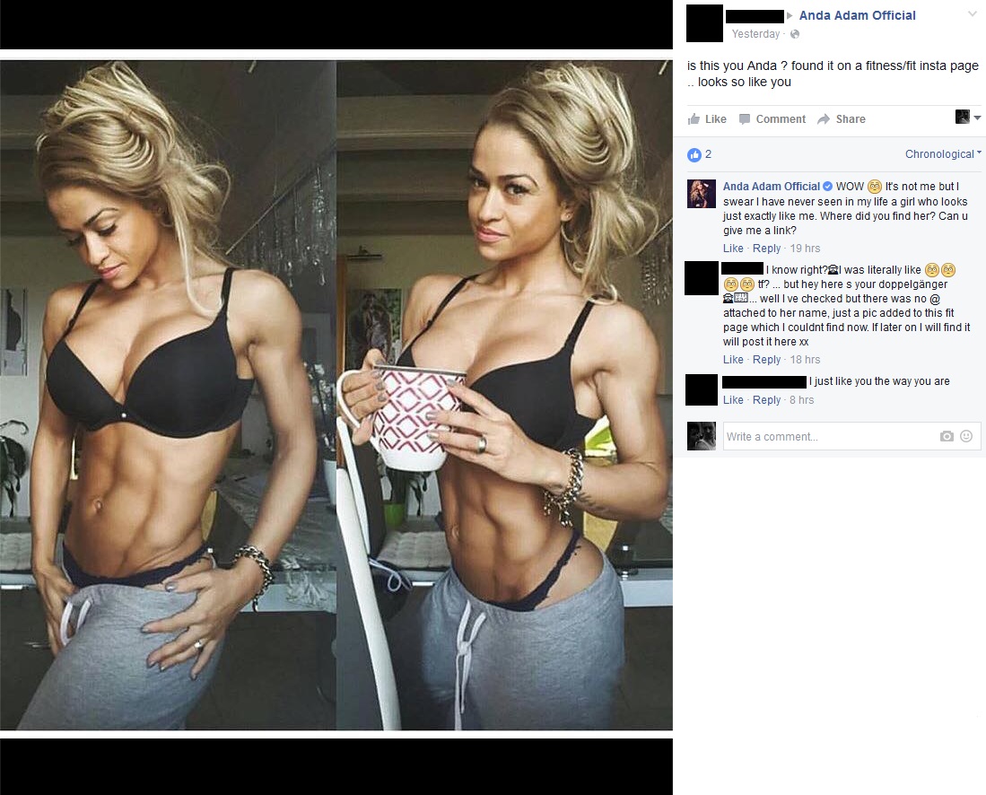 Dacă nu ai fi văzut-o cu haine, ai fi jurat că e Anda! Un fan de-al său i-a postat pe Facebook o fotografie cu o femeie care seamănă leit cu vedeta. Tânăra care a descoperit sosia Andei Adam susţine că ar fi găsit fotografia pe o pagină de fitness, crezând că este chiar Anda Adam.