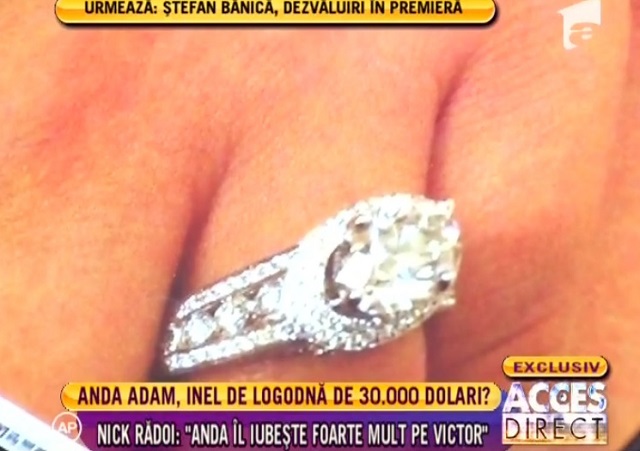 "Inelul a aparţinut fostei sale logodnice şi nu a fost special cumpărat pentru Anda Adam. În plus, nici nu este atât de scump precum se scrie în presă. Nick Rădoi este un bărbat cu bani, dar să nu exagerăm. Nu e chiar aşa precum se spune. Inelul costă undeva în jur de 15.000 de dolari, nu 30.000. Cred că dacă ar vedea Anda factura, ar intra în depresie!", a spus Alina Radi.