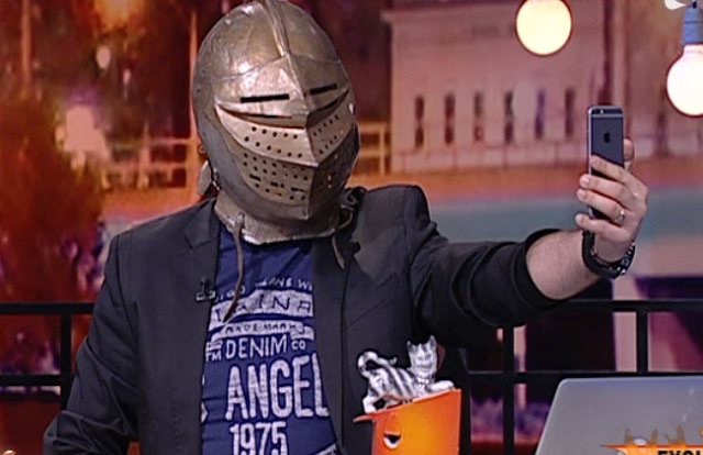 Dan Capatos a luat o mască "înfricoşătoare", care-i acoperea complet chipul, şi şi-a făcut un selfie cu ea, spre amuzamentul Marianei Calfa. Poza a ajuns, apoi, pe contul de Instagram al prezentatorului. "Mă protejez şi eu de subiecte aşa cum pot. Să nu-mi dea la cap", a glumit Dan Capatos, după ce şi-a pus armura pe cap.