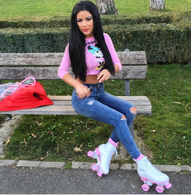 Îmbrăcată cu o bluză mai sus de buric și cu un imprimeu cu Minnie Mouse, dar și cu o pereche de blugi tăiați în genunchi, fosta protagonistă a emisiunii ”Burlăcița” la plimbare în parc cu rolele, în pădurea Băneasa.