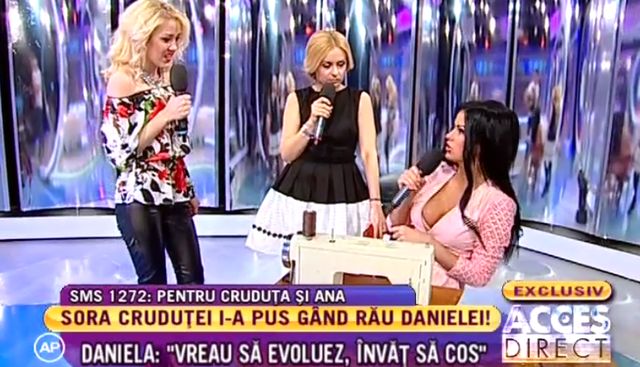 Vedeta vrea, se pare, să-i calce pe urme surorii sale, Ana, care este croitoareasă cu acte în regulă şi, pentru a demonstra că poate să facă orice, Cruduţa a încercat maşina de cusut în direct. Ei, ce credeţi că s-a întâmplat? Daniela nu a reuşit să creeze nimic şi a fost protagonista unui mic accident. Tocul de la sanda i-a rămas blocat în pedala maşinii, iar bruneta a reuşit să stârnească hohote de râs.