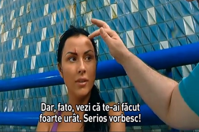 Şi-a făcut curaj, a sărit de la 10 metri, însă s-a accidentat grav la frunte. La impactul cu apa bazinului, pielea de pe fruntea brunetei a crăpat, iar sângele a început să-i curgă şiroaie pe obraz. Nici măcar în aceste momente, Daniela nu a renunţat la zâmbetul de pe buze.
