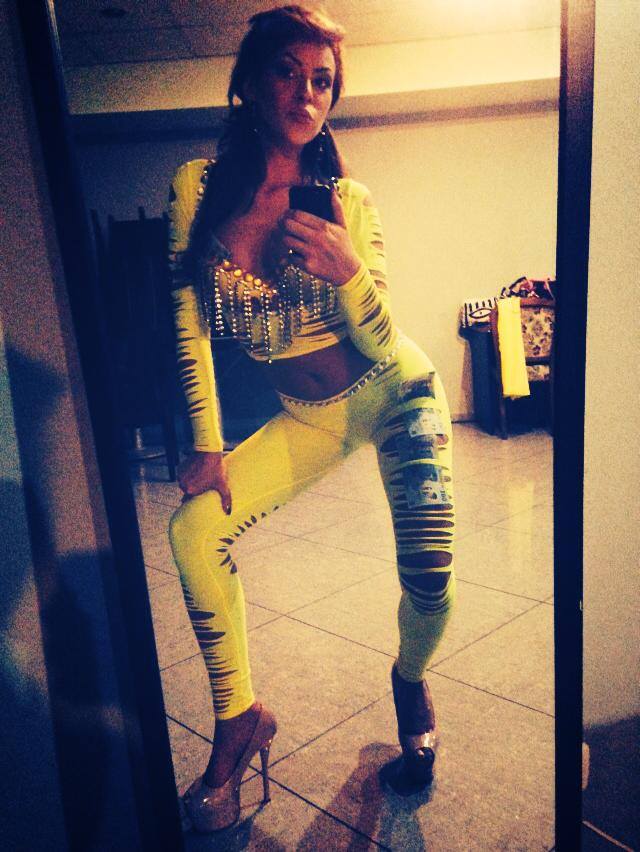Daniela Stan a postat pe contul personal de Facebook o fotografie cu ea după un eveniment in club. În poza cu pricina se văd pe alocuri câteva bacnote primite în timpul dansului, cel mai probabil de la cei care îi admiră munca. Într-o poziţie extrem de senzuală, fericită probabil că seara s-a terminat cu bine, Daniela s-a fotografiat pe fugă.