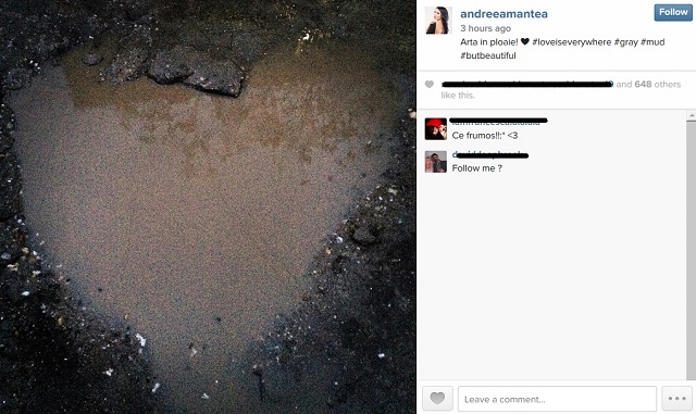Ei bine, în loc să fie supărată că drumurile din România sunt pline de astfel de "cratere", viitoarea mămică a văzut arta din imagine, inimioara care i-a înseninat ziua: "Arta în ploaie", a scris Andreea Mantea.