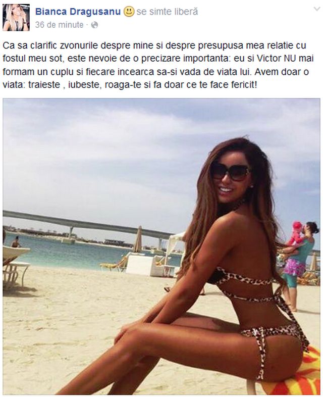 "Ca sa clarific zvonurile despre mine si despre presupusa mea relatie cu fostul meu sot, este nevoie de o precizare importanta: eu si Victor NU mai formam un cuplu si fiecare incearca sa-si vada de viata lui. Avem doar o viata: traieste , iubeste, roaga-te si fa doar ce te face fericit!", a menţionat vedeta pe reţeaua de socializare.