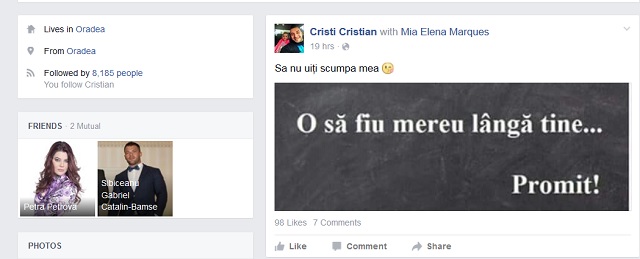 Cristi se iubeşte cu o femeie din Columbia pe nume Mia, căreia îi face tot felul de declaraţii pe Facebook. Fostul concurent a uitat-o complet pe Deea şi este topit după noua lui iubită. "O să fiu mereu lângă tine!", i-a spus Cristi partenerei sale.