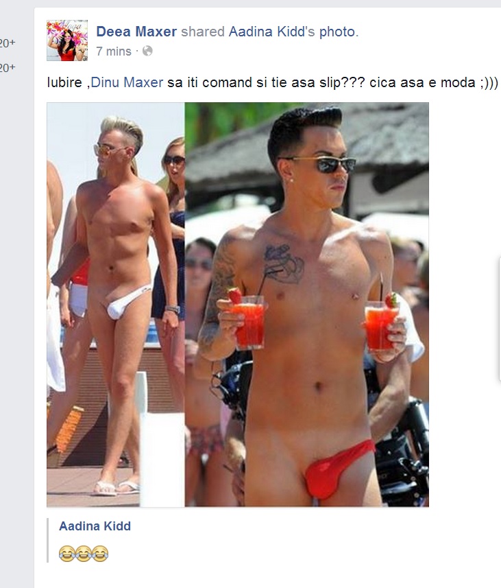 A văzut că sunt la modă, aşa că s-a gândit că şi lui Dinu Maxer i-ar sta bine cu ei. Deea vrea să-i dea soţului slipi care acoperă doar zonele intime şi se prind de corp e un singur picior. Mai mult decât atât, în pozele pe care bruneta i le-a prezentat lui Dinu se află şi nişte slipi roşii, ceea ce i-a făcut pe prietenii ei "virtuali" să fcă glume pe seama lui Dinu. "S-a adaptat Dinu? E în pas cu moda?", au râs ei.