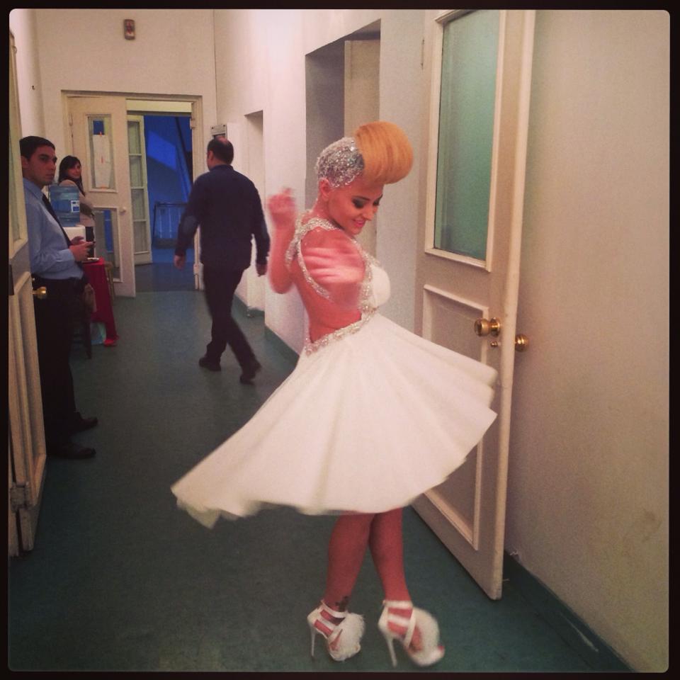 Într-o rochie albă, vaporoasă, cu spatele gol, gen Marilyn Monroe, Delia s-a pozat în culisele unui concert. Sandalele înalte, extravagante şi coafura originală îi întregesc look-ul de cântăreţei. "Ce frumoasă e rochia", "Ce fashion suntem" sunt doar câteva dintre comentariile lăsate de prietenii virtuali.