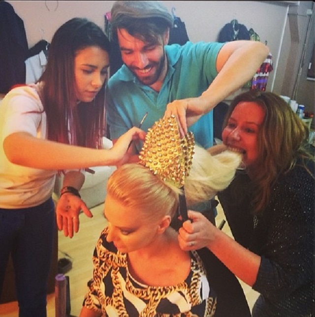 O întreagă echipă a lucrat la coafura Deliei de seara trecută, aceştia au făcut tot posibilul pentru ca jurata "X Factor" să arate impecabil. Delia a postat pe contul personal de socializare o fotografie în care apare alături de alte trei persoane. Aceştia îi aranjează părul artistei şi cum îşi doresc să iasă totul perfect nu s-au sfiit să se folosească de mijloace mai puţin practicate în acest domeniu. Una dintre persoane a tras efectiv cu dinţii de părul Deliei, ajutându-se de acest lucru pentru ai fixa coroana pe cap. Într-un final totul a ieşit aşa cum şi-au propus, apariţia vedetei fiind una de excepţie.