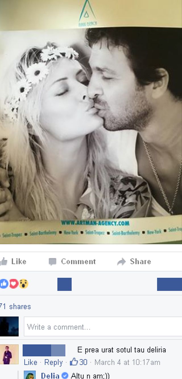 Jurata a publicat pe Facebook o imagine în care apare alături de partenerul său de viaţă într-o ipostază tandră. Unul dintre fani şi-a permis să-i scrie că soțul ei este urât. Comentariul răutăcios a fost aspru taxat de ceilalți internauți, însă Delia i-a dat o replică care a lăsat pe toată lumea cu gura căscată. "Nu am altul", a replicat artista, iar fanii s-au înghesuit să îi dea like.