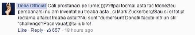 ”Câți prostănaci pe lume ;))) ??!! Păi tocmai asta fac ! Donez! Eu, persoana! Și nu am inventat eu treaba asta...ci Mark Zuckerberg! Sau și el tot pt reclamă a făcut treaba asta!? Nu sunt "dume"sunt Donații făcute într un stil "challenge"! Pace voua! ;)) ! Și iubire!”, le-a răsuns Delia.