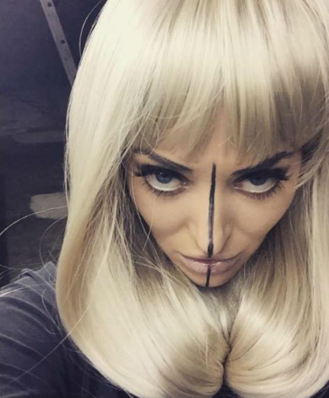 Delia are un machiaj extravagant, format din linii negre pe faţă, iar atitudinea ei este una pe măsură. Blonda rămâne la fel de frumoasă şi cu acest tip de machiaj care nu poate să fie purtat la orice oră din zi.