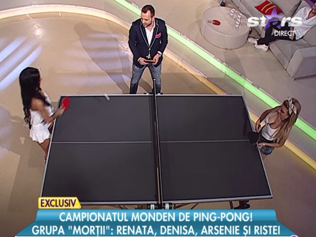 Concentrată la meci, Denisa şi-a arătat de câteva ori fundul apetisnt care-i ieşea puţin din pantalonii foarte scurţi din denim pe care-i purta. Mai mult, sânii blondei mai aveau puţin şi-i ieşeau şi ei din maioul extrem de decoltat şi-i săreau de fiecare dată când ea făcea câte o mişcare care-i aducea puncte în faţa Renatei. Până la urmă, Denisa a câştigat meciul cu colega ei de platou şi a jucat "finala" cu Arsenie.