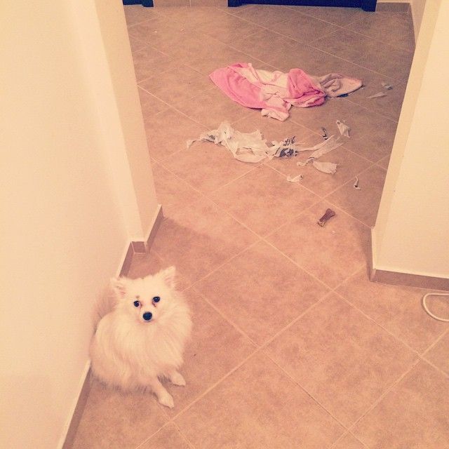 În momentul în care aceasta a ajuns acasă, simpatoicul căţel alb o aştepta liniştit şi spăşit în hol. Şi avea şi motive să fie aşa, pentru că făcuse ditamai boacăna, care probabil a făcut-o pe DianaDumitrescu să-şi pună mâinile în cap.