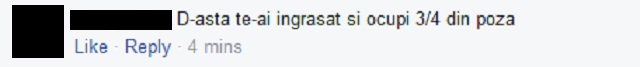 Unul dintre fanii săi a comentat rapid la fotografie, jignind-o pe tânără. "Te-ai îngrăşat şi ocupi 3/4 din poză", a scris acesta la fotografie. Supărată, Diana a reacţionat imediat şi l-a anunţat că îi blochează contul de facebook.