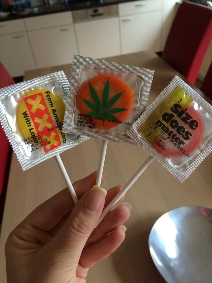 Alături de prezervativele cu aromă de marijuana şi mesaje amuzante, precum "Mărimea nu contează", Ginger Devil şi-a cumpărat şi două acadele sexy şi totodată extrem de haioase, în formă de penis şi de vagin.