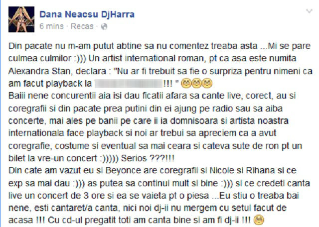 "Concurenţii ăia îşi dau ficaţii afară să cânte live, corect, au şi coregrafii şi din păcate prea puţini dintre ei ajung pe radio sau să aibă concerte, mai ales pe banii pe care îi ia domnişoara şi artista noastră internaţională face playback şi noi ar trebui să apreciem că a avut coregrafie", a scris DJ Harra, pe contul de Facebook.