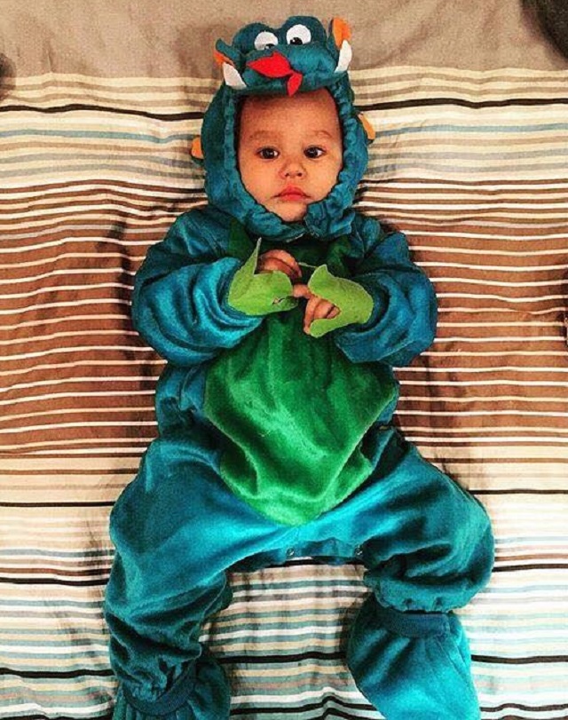 Alex a postat o fotografie cu Dominic îmbrăcat într-un costum haios, cu albastru și verde, alături de mesajul „să aveți o zi frumoasă și plină de bunătate și iubire”.